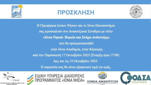 Η Περιφέρεια Ιονίων Νήσων και το Ιόνιο Πανεπιστήμιο θέτουν υπό την αιγίδα τους, το Αναπτυξιακό Συνέδριο Ιονίων Νήσων με τίτλο «Ιόνια Νησιά: Πορεία και Στόχοι Ανάπτυξης» και θα πραγματοποιηθεί στις 17-19 Οκτωβρίου 2025 στην Ιόνιο Ακαδημία στην Κέρκυρα.