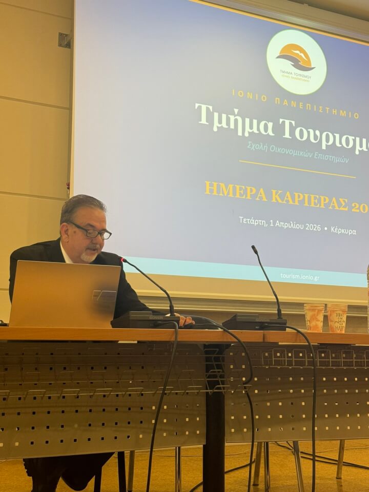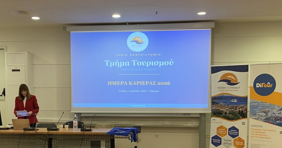 Με επιτυχία πραγματοποιήθηκε την Τετάρτη 1 Απριλίου 2026 η εκδήλωση «Ημέρα Καριέρας 2026» που διοργάνωσε το Τμήμα Τουρισμού του Ιονίου Πανεπιστημίου. Η δράση είχε ως βασικό στόχο τη διασύνδεση των φοιτητών και αποφοίτων με την αγορά εργασίας και την ενίσχυση της συνεργασίας του Τμήματος με φορείς και επιχειρήσεις του τουρισμού.